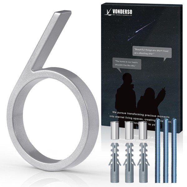 VONDERSO 5 Inch Floating House Numbers and Letters for Outside, Modern Metal Address Number 6, with Weather Resistant Silver Powder Coating, No Fading (Glossy Silver)