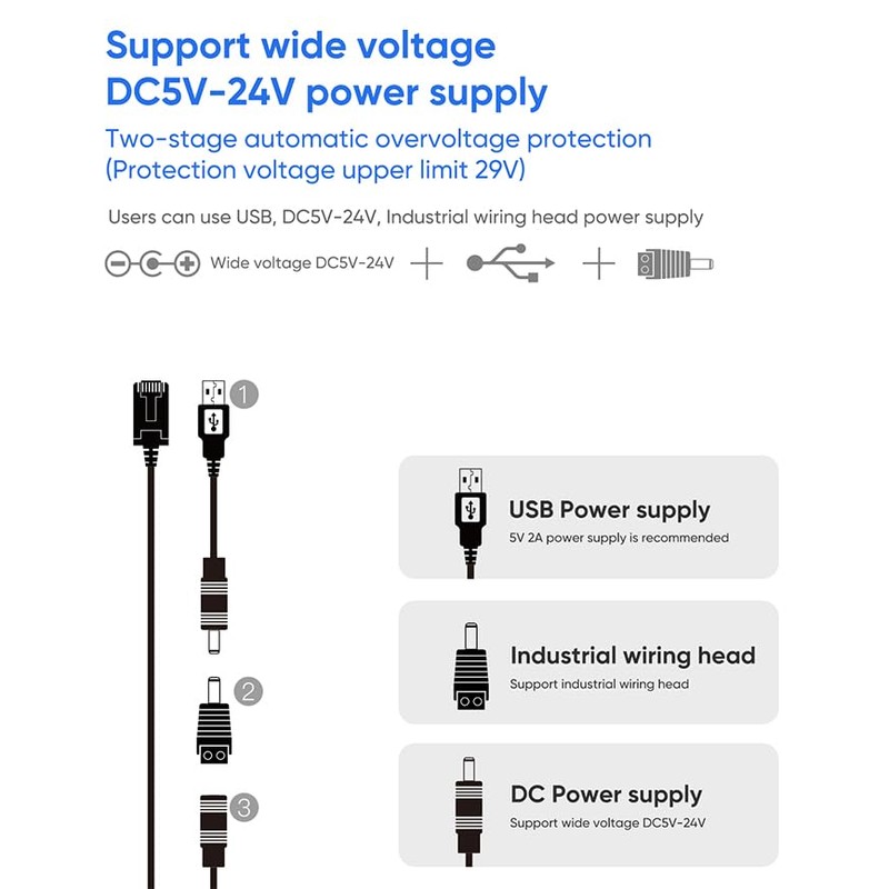 - Power and parameters: Power supply via wide voltage DC5V-24V (typical 5V/2A or 12V/1A, ripple under 100mV), two-stage automatic surge protection (protection voltage upper limit 27V), optional USB or DC power supply mode; 1 mounting kit and 1 industrial DC connector, more suitable for industrial applications