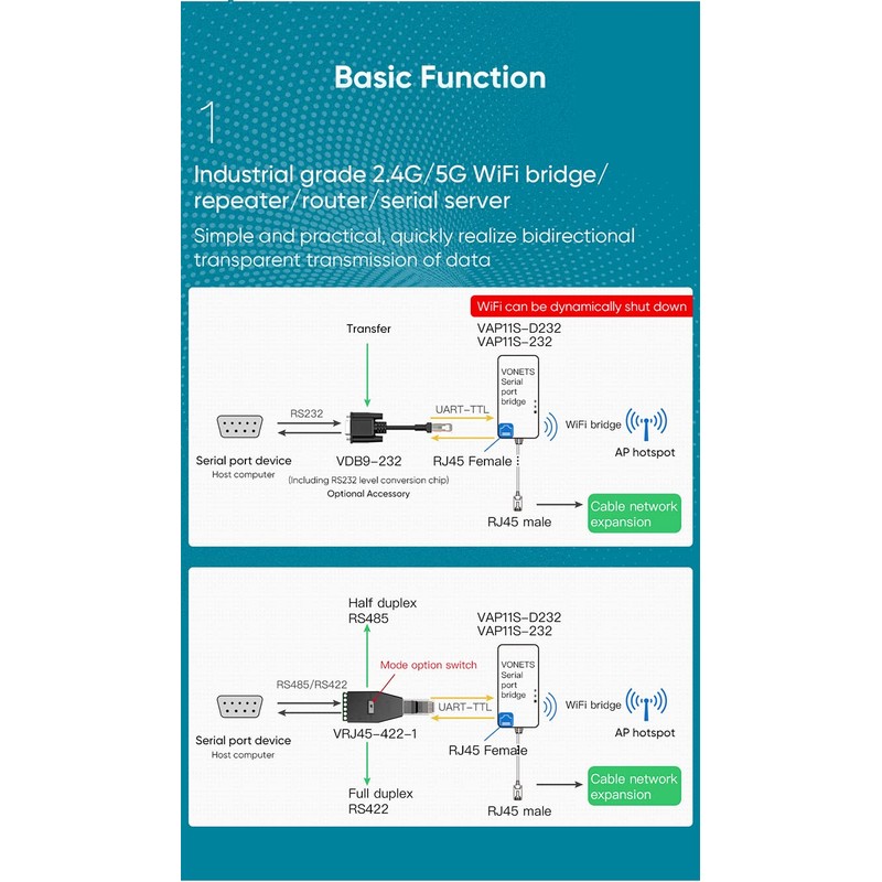- đ¶ ăDual band WiFi Serial Port Server/BridgeăIndustrial Dual band 2.4GHz/5GHz Serial Port Server WiFi Bridge Wireless Repeater WiFi to Ethernet Adapter; can achieve WiFi to Wired or Wired to WiFi function; Support 802.11b/g/n/a/ac, WiFi rate: 2.4GHz: 300Mbps+5GHz: 900Mbps (theoretical value);