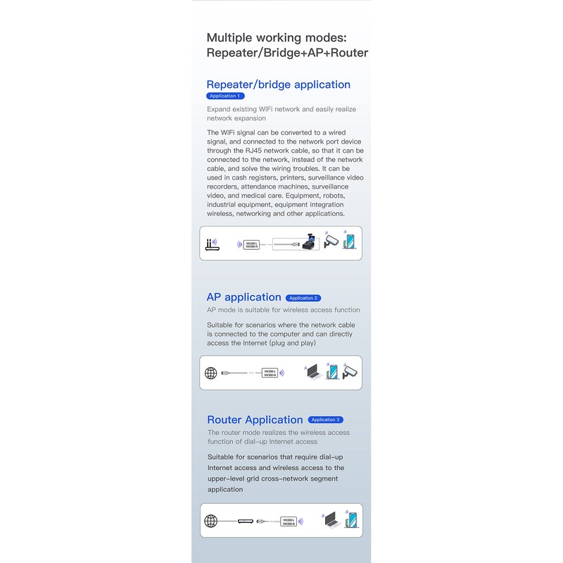 - 【Support two kinds of application methods】: Router mode ; WiFi Bridge ( IP layer or MAC layer transparent transmission); WiFi Repeater (WiFi signal repeater), can extend WiFi transmission distance;WiFi access point (AP);