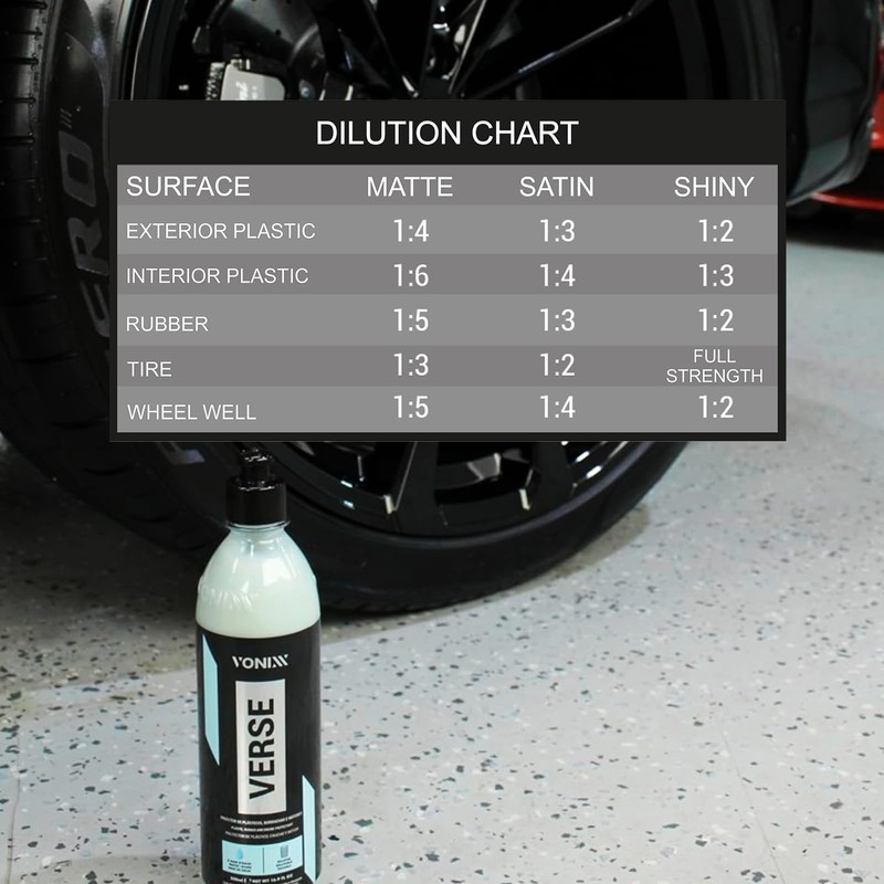- Durable Protection: Verse offers enduring performance, whether used diluted or at full strength, thanks to its exceptional water resistance. This makes it an essential choice for tire shine.