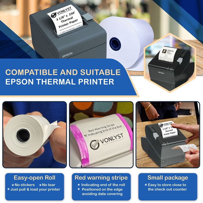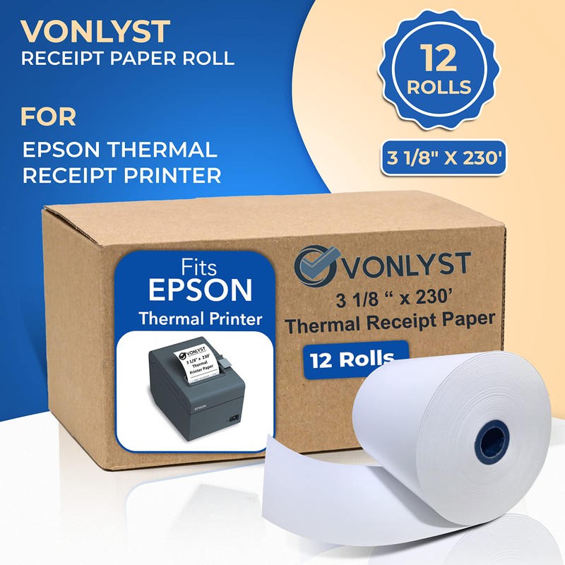 - PAPER ROLL SIZE designed to maximize the performance of your Epson Receipt Printer Vonlyst thermal receipt paper rolls are precisely manufactured in size of 3 1/8 x 230' (width x length)