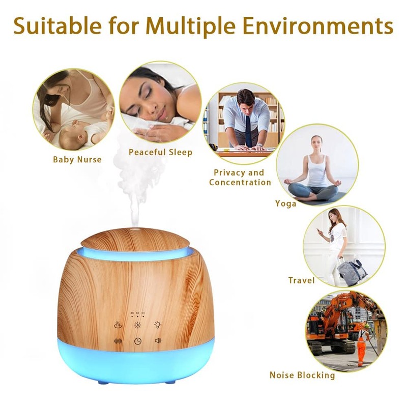 - 5-IN-1 MULTIFUNCTIONAL DEVICE: This is an premium aromatherapy device unlike any other you've ever used, it can be regard as a white noise machine or a essential oil diffuser or a humidifier, It features a large and easy to clean 300ml water tank, 7 different ambient color lights, 2 levels of warm night light,10 soothing sounds and timer setting for sound playback, waterless auto shut-off protection.