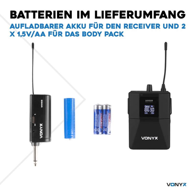 With the WM55B Wireless Pocket Transmitter Microphone Plug-and-Play UHF you are ready for first-class audio transmission without the hassle of cables. Perfect for stage and studio performances. Even in the fitness industry, the microphone fitness trainer and wireless microphones are also increasingly used in companies and schools for presentations and events of all kinds.