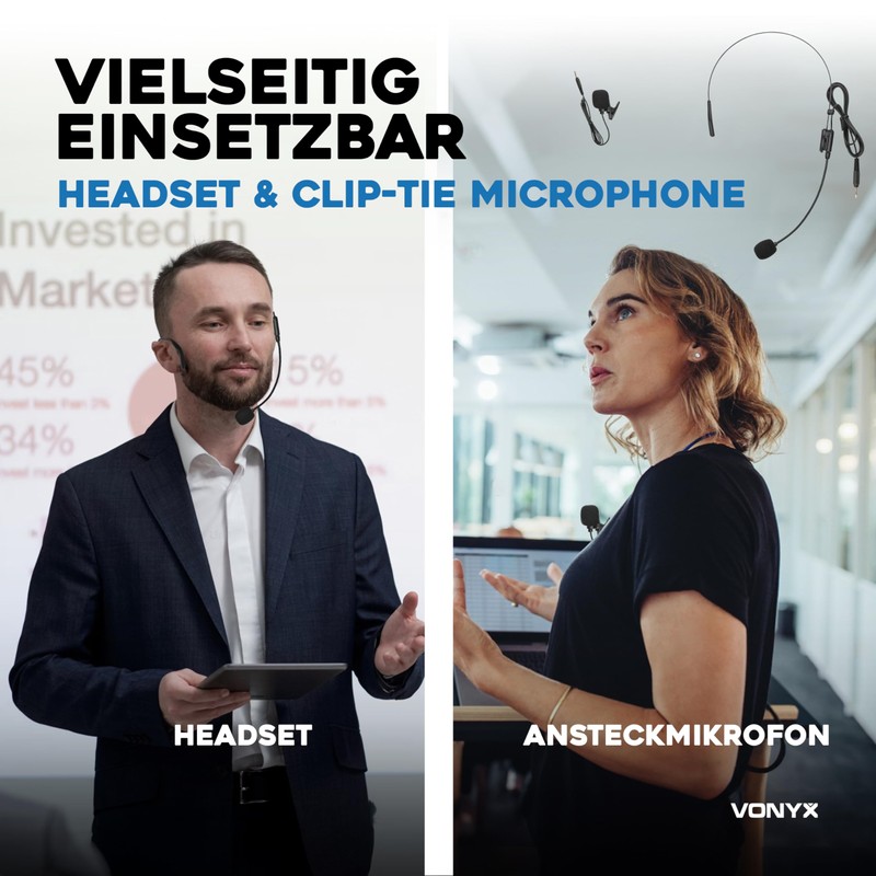 - Areas of application: the microphone headset and the lavalier microphone can be used optimally for presentations, interviews, live performances, weddings or trainings and is ready to use in seconds.