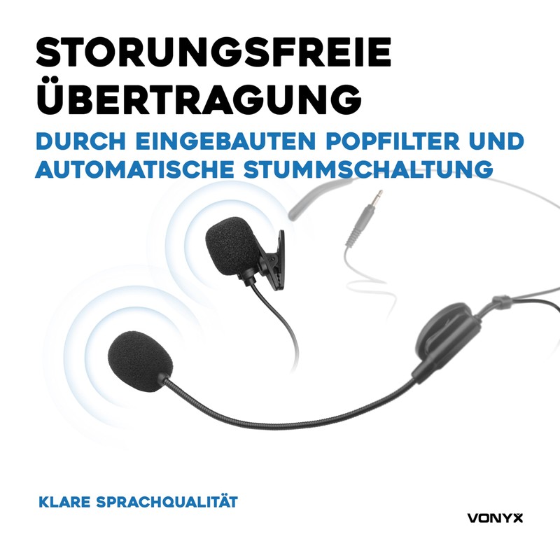 Vonyx WM55B Wireless Microphone Set, Headset Microphone and Lavalier Microphone Wireless with Plug-in Receiver, Lapel Microphone Wireless up to 50 m Range with Pop Filter, UHF 863-865 MHz, Mini