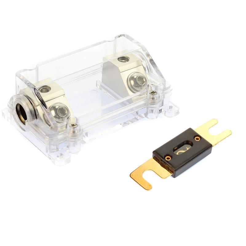 ANL Fuse - Holder Voodoo Brushed Nickel 2/0 or 1/0 0 Gauge - w/ 45 Deg Angled Cover Voodoo inline ANL fuse block 2/0 or 1/0 AWG in and 2/0 or 1/0 AWG out Solid brass blocks Brushed Nickel plated washer ANL Fuse.