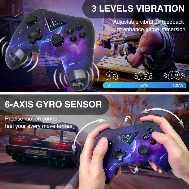 - DOUBLE VIBRATION & 6-AXIS SENSORS Built in dual motors with adjustable vibration ensure an intense gaming experience, and the sensitive 6-axis gyro sensors can accurately detect movement and help you respond quickly.