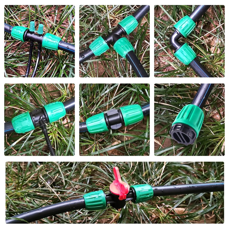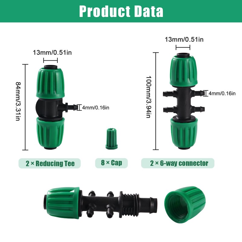 - The package includes: this 22 piece barb connector kit includes 2 diverter valves, 2 T connectors, 2 6 way connectors, 2 reducing tees, 2 angle connectors, 2 straight connectors, 2 end connectors and 8 caps.