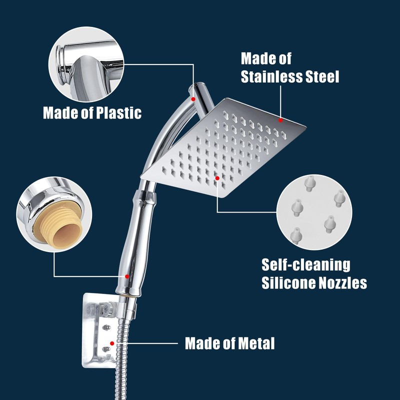 - HIGH QUALITY MATERIAL - Shower head made of polished stainless mirror finish; the handle is made of plastic, Luxury modern chrome look. Suitable for wall mounting. If you are looking for a rain shower experience, just adjust the bracket and the swivel ball connector. It can satisfy most users.