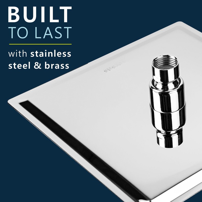 -The Soften Rubber Jet Nozzles prevent the build-up of minerals, easy for Blockage Removal by fingers. The Shower head body made from high quality 304 stainless steel. We use Stainless Steel Hose with the solid brass connection fittings that won't crack or split.