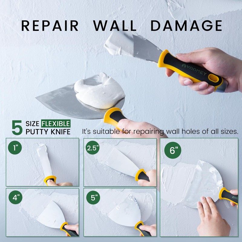 - 6 Sizes of Paint Scraper Tool: 1 multi-purpose Stiff putty knife, 5 psc flexible drywall knives (6 in,5 in,4 in ,2.5 in ,1 in )