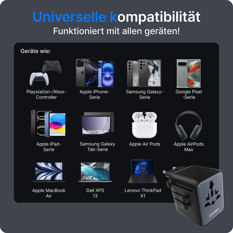 VOOMY Travel Adapter Worldwide 28 W, Universal Travel Plug with 3 USB-C and 2 USB-A, Socket Adapter Europe, UK, Australia, Japan, Thailand, Travel Adapter USA, Travel Plug Adapter Worldwide, Travel