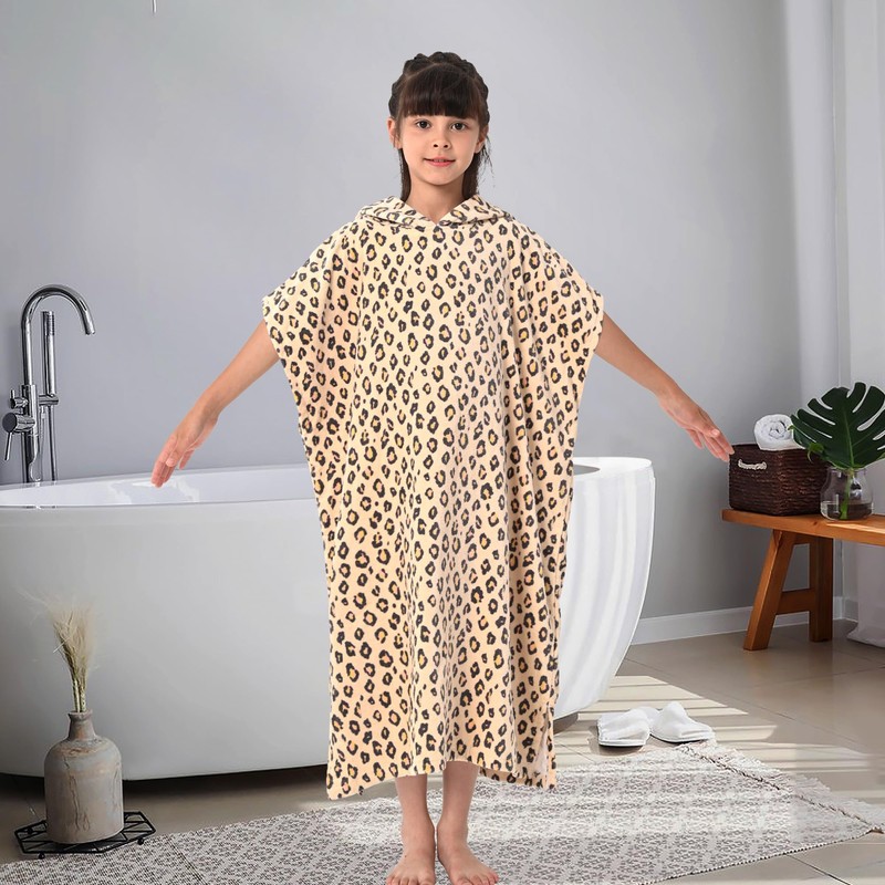 VOOVA & MOVAS Towels Robe for 8-14 Girl Teens,Wearable Cotton Poncho Towel for Big Kids, Large Absorbent Hooded Towel Dress for Pool | Bath | Swim, Leopard Print
