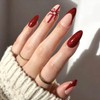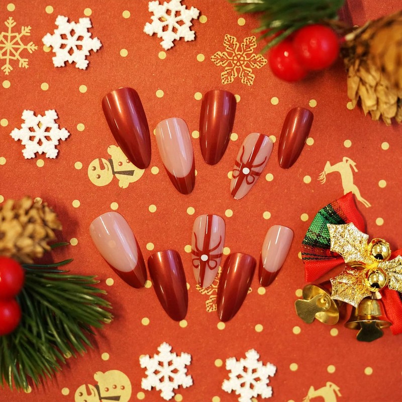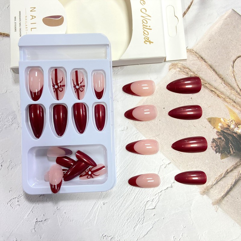 Vopintpy Christmas Bow Press on Nails Long Almond Fake Nails Wine Red French Tip Glue on Nails with Solid Color Design Reusable Full Cover Stick on Nails for Women DIY Winter Xmas Manicure