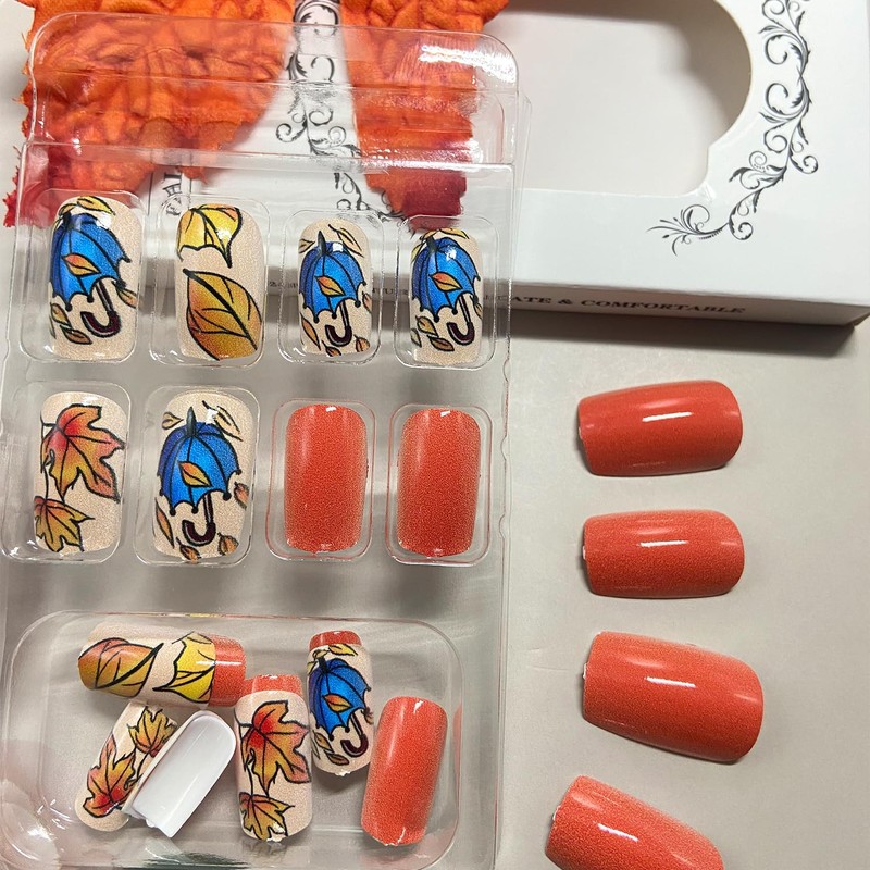 • Easy to Use: Instead of spend lots time and money at nail salon, you can change you nails style in 15 minutes anytime and anywhere. The maple leaves fake nails will stay longer if you clean your nails before use, and avoid water within the first hour of wearing