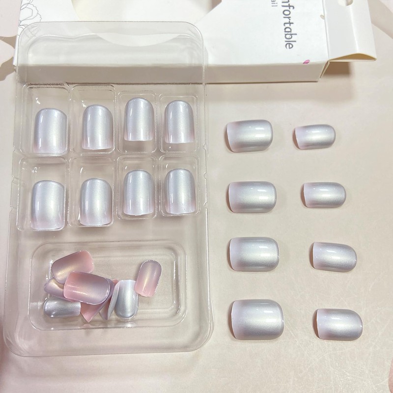 Vopintpy Silver White Gradient Press on Nails Short Square Mirror Fake Nails Artificial Acrylic Glue on Nails Reusable Full Cover Stick on Nails for Women DIY Charm Manicure