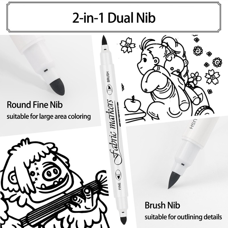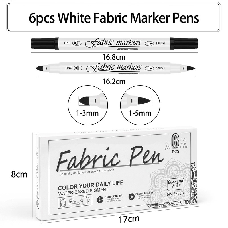 - Double tip design: One of them is a brush tip that is soft and can be bent. The nib ranges from thin to wide and the line width is 1-5 mm, which allows for complex details to be displayed. The other is a round, fine tip that has a line width of 3 mm and can draw large strokes. From fine lines to large areas, you can easily create stunning designs on a variety of fabric materials