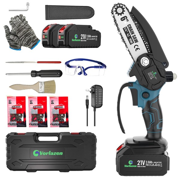 - 1. STRONG DYNAMIC SYSTEM – POWERFUL & PRECISE CUTTING The Vorlazen 6-inch mini chainsaw cordless features an upgraded dynamic cutting system with a high-speed manganese steel chain and auto lubrication, delivering smooth, effortless cuts through branches up to 6 inches thick. Perfect for tree trimming, garden clearance, and firewood prep, it outperforms manual saws and bulky gas models.
