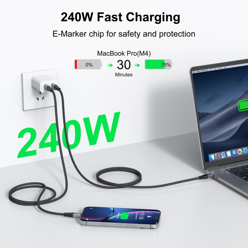 - 240W Fast Charging: The 240W fast charging technology, paired with a compatible charger, delivers up to 48V/5A output and supports Extended Power Range (EPR) compatibility at 100W, 140W, and 180W. Featuring a built-in E-Marker chip, it ensures safe, stable charging with battery protection.