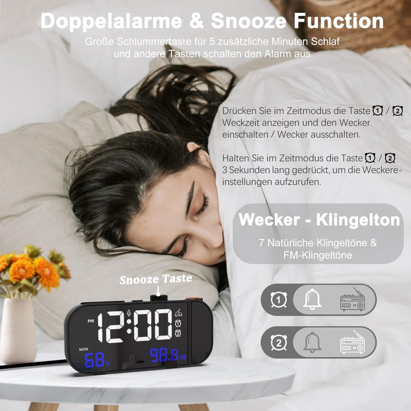 - Radio alarm clock with projection - Seven natural ringtones and FM ringtones replace conventional alarm sounds, wake up in a good mood.