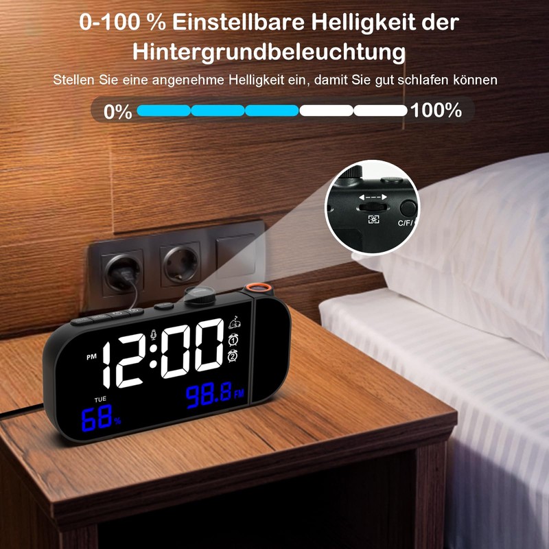 - Alarm clock projection - Wake up with alarm 1 or alarm 2. The alarm volume (stepless) can be adjusted to the desired level.