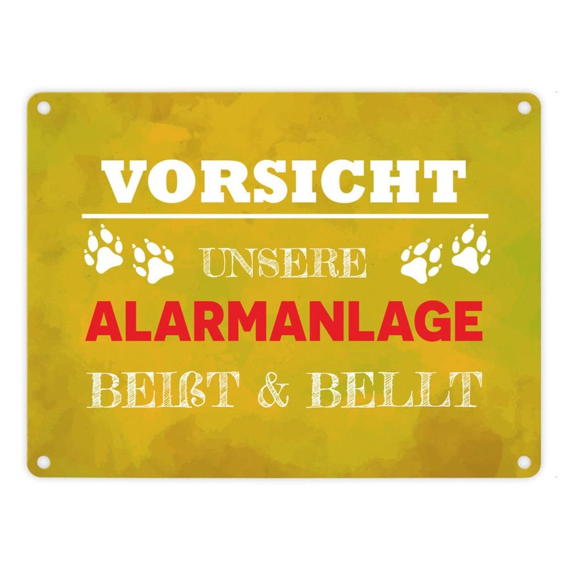 - The metal sign shows the text 'Vorsicht, unsere Alarmanlage beißt & bellt' with dog paws as decoration. The background is in yellow, optionally also in three other colours.