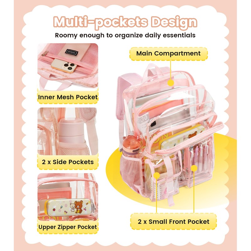 - Diseño de múltiples bolsillos: esta mochila transparente para niñas y niños mide 16 x 12 x 5.5 pulgadas y cuenta con múltiples compartimentos para organizar los artículos esenciales de la escuela. El compartimento principal con cremalleras dobles se adapta a libros y ropa y tiene un bolsillo interior de malla para teléfonos/llaves. 3 bolsillos delanteros para objetos pequeños, mientras que 2 bolsillos laterales de malla son perfectos para botellas de agua y sombrillas