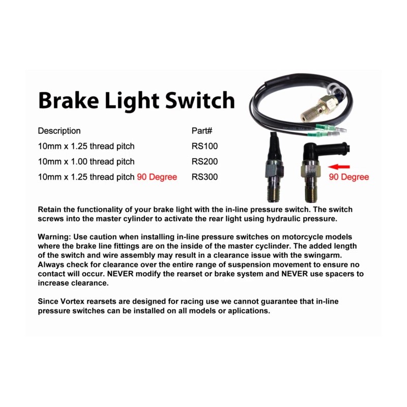 Since Vortex Racing rear-sets are designed primarily for racing use we cannot guarantee that inline pressure switches can be installed on all models or applications.