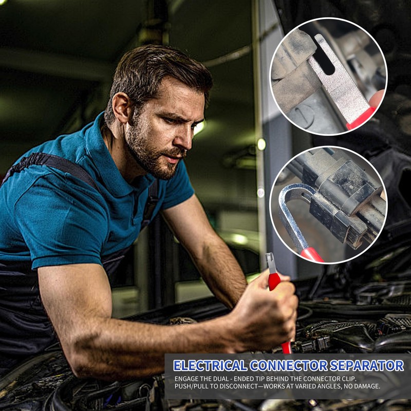 Tired of struggling with stubborn electrical connectors? The VOURTM Electrical Disconnect Pliers simplify automotive repairs.[Premium Material]Our electrical disconnect pliers are made of high-carbon steelstrong, rust-resistant, and durable for repeated use. The plastic-coated anti-slip handles ensure these electrical disconnect pliers for cars are comfortable to hold and labor-saving for pros or DIYers.[Easy Connector Removal]These electrical connector pliers effortlessly remove locking push-tab connectors (ideal for mass air flow sensors, fuel injectors, ignition coils, etc.). The separator grabbing jaw enables one-handed use in tight spots, simplifying hard-to-reach clips.[Versatile Separator Tool]This electrical disconnect pliers (straight + 60-degree angles) meets different usage needs. Position the tip behind clips, push/pull to disconnectno damage to wires. It doubles as a clip removal tool for small terminals to large harnesses. Angled heads reach where straight pliers can't, adding versatility to your electrical connector pliers.[Wide Automotive Use]These electrical disconnect pliers work for cars, SUVs, trucks, off-road vehicles (any make/model). The hose clamp pliers handle clamps; the clip removal tool simplifies stubborn tabs, making them essential automotive electrical tools for mechanics and car owners.[Complete Kit Included]1 x Straight Plier1 x 60-Degree Plier1 x Hose Clamp Plier1 x Double-Ended Connector Separation ToolChoose the VOURTM Electrical Connector Pliers set for easier, more efficient repairs!24-month warranty and round-the-clock support for confident buying.