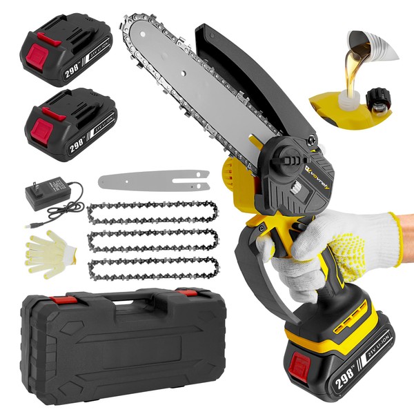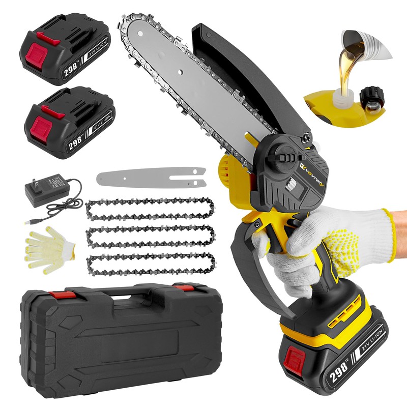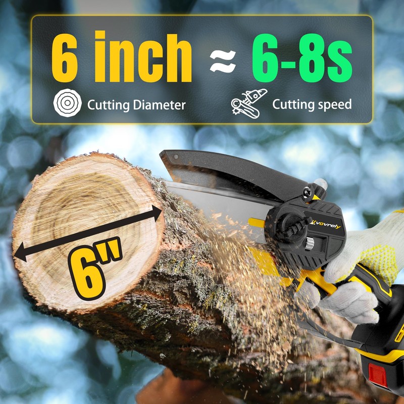 VOVRELY 6 Inch Mini Chainsaw Cordless, Brushless Electric Chainsaws w/Automatic Oiler/Tool-Free/2 Batteries & 3 Chains, Portable Chainsaw for TreeTrimming, Wood Cutting, Garden, Household & Courtyard