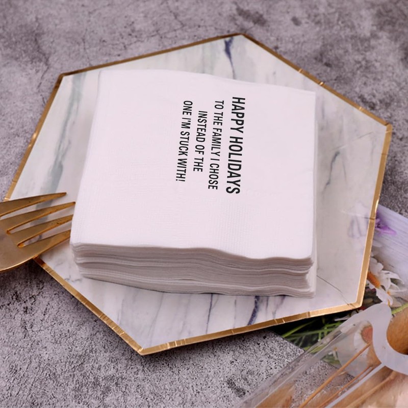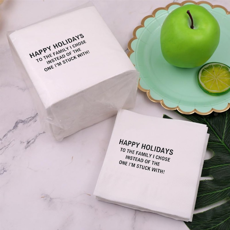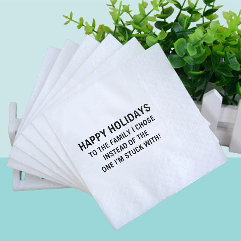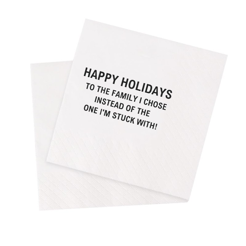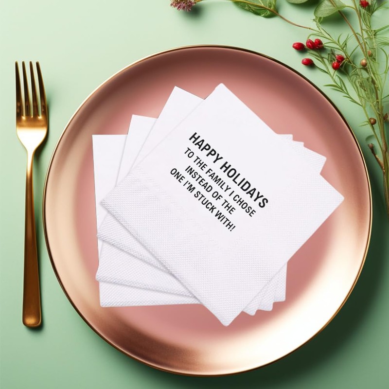 - Add a touch of humor to your holiday gatherings with these napkins that read, “Happy Holidays to the Family I Chose Instead of the One I’m Stuck With.” Perfect for lightening the mood!