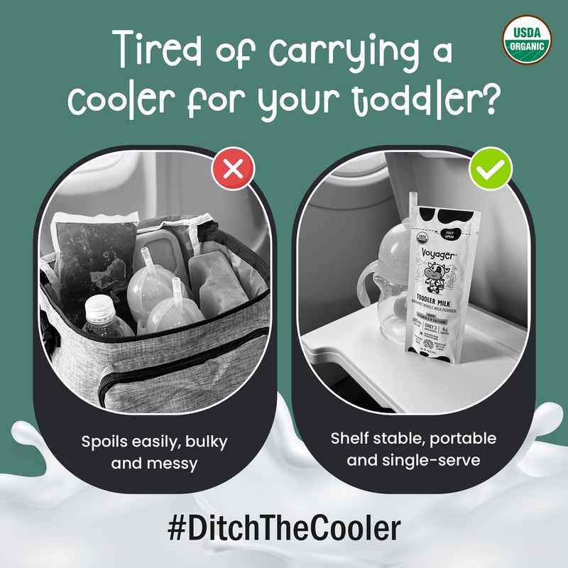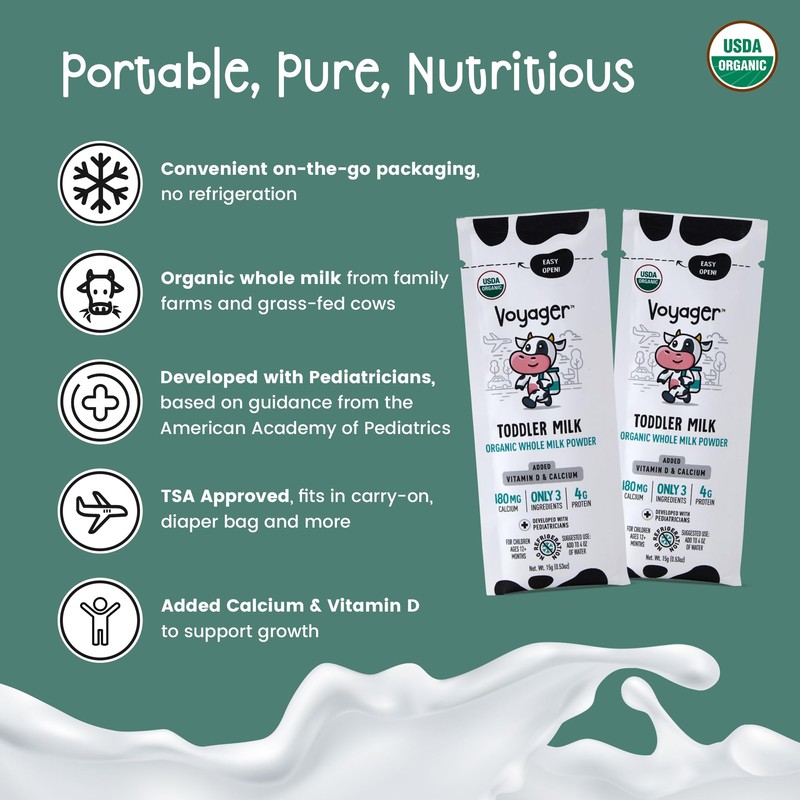 - 🧊NO REFRIGERATION NEEDED: Voyager Milk sachets are organic, shelf stable, single-serve, and ready to go. Simply add our dry milk powder to 4fl oz. of water, shake and serve. Voyager is quick & convenient for parents of toddlers that are always on the go!