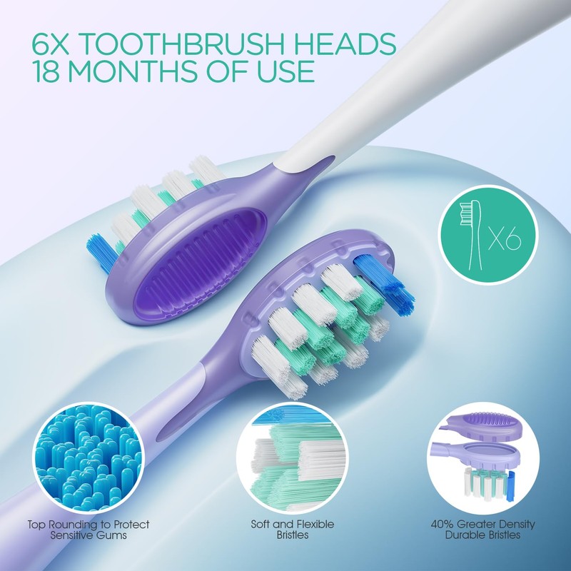 - 6 Replacement Brush Heads: Comes with the convenience of 6 replacement brush heads, lasting for 18 months, offering longevity in your oral care routine; The W-shaped design is in line with the shape of teeth, which can deeply clean the teeth gaps; The end rounded design is gentle and safe for gum