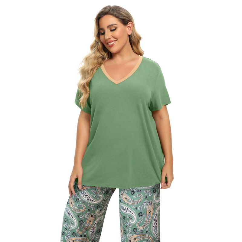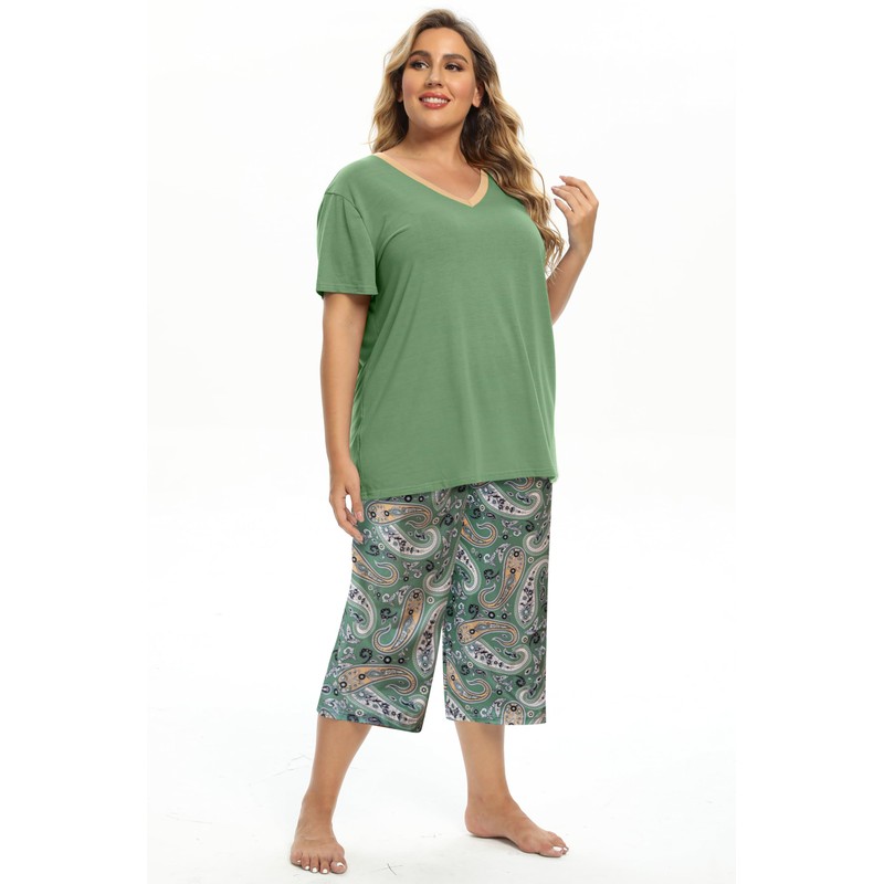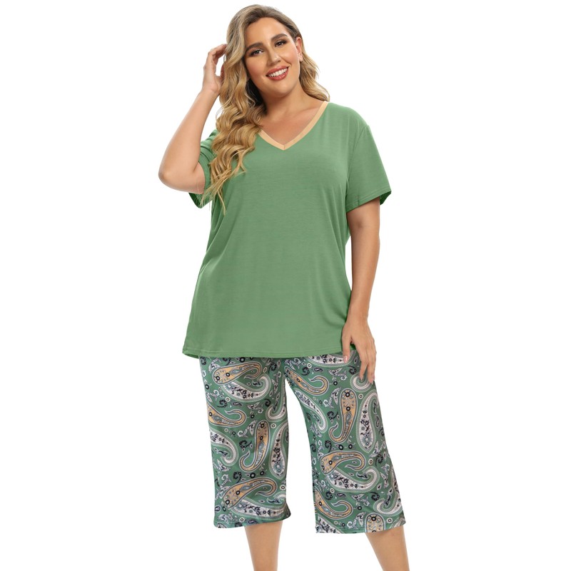 Vozanet Women's Pajamas Set Soft V Neck Sleepwear Top and Capri Pj Lounge Sets Plus Size Novel Floral Design Elegant Loungewear Capri Sets, Paisely Green, X-Large