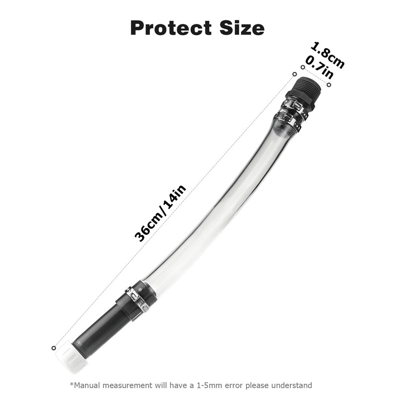 - 14-inch transparent fuel tank hose with a 3/4 inch thread size (standard), compatible with 5-gallon fuel jugs, LC2 tanks, tractors, and Scribner fuel tanks.