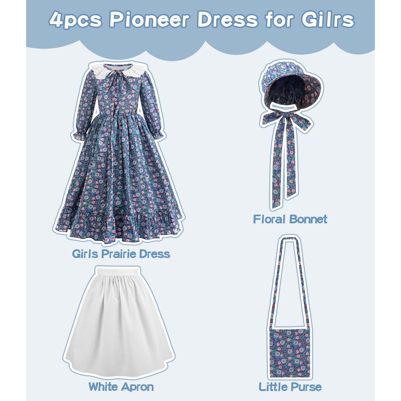 - Girls Pioneer Costume Set includes :1*Pioneer Girls Dress ,1*white Apron,1*Bonnet and 1*bag,Wear the completed Pioneer suit dress and experience the avant-garde style.