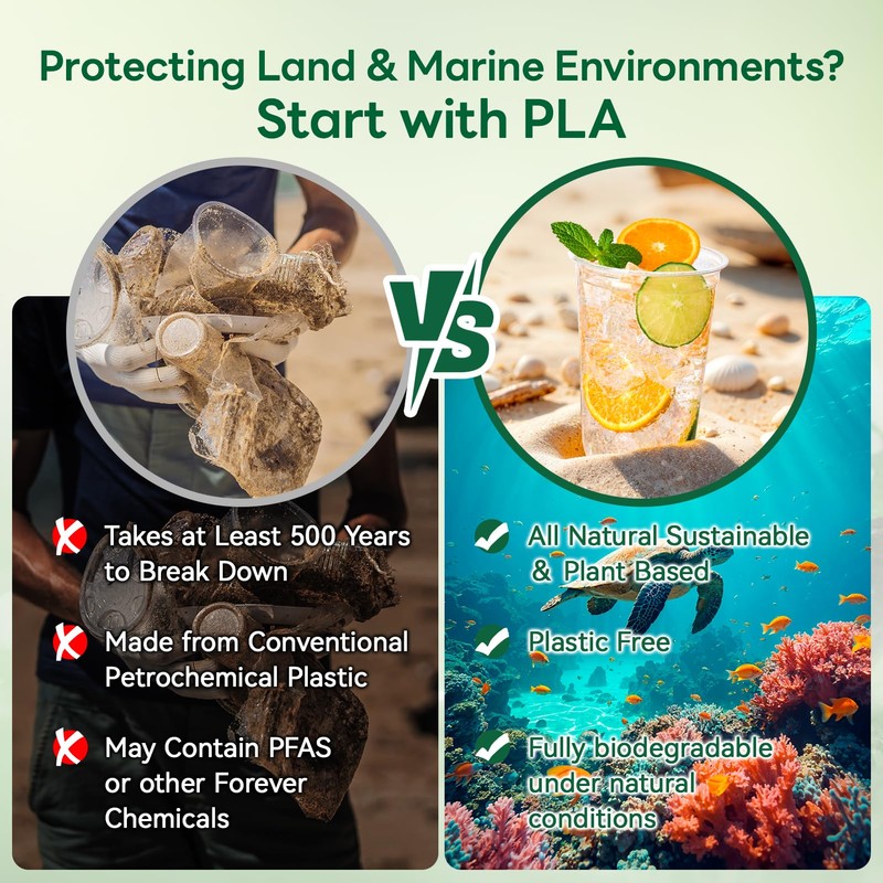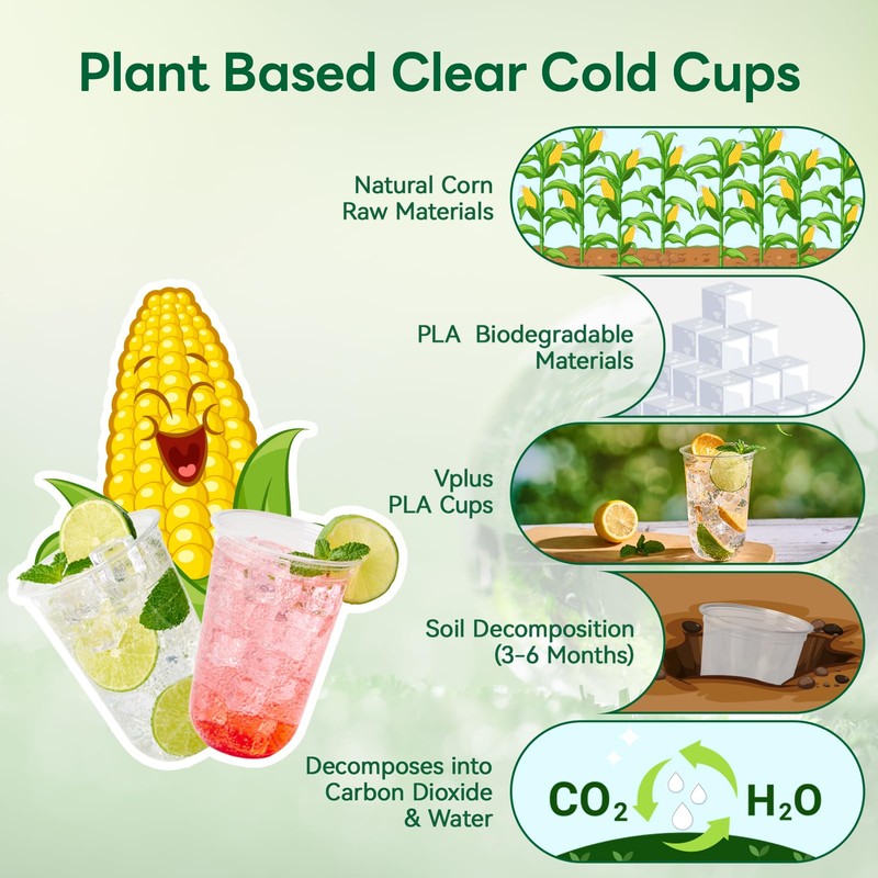 - Eco Materials: These biodegradable cups are made from polylactic acid (PLA), a plant-based material derived from corn starch. They contain no petroleum or bisphenol A (BPA) compounds,making sustainability easier