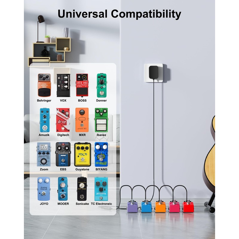 • Wide Compatibility: This power supply is compatible with most electric guitar effect pedals from brands such as Donner, Boss, Roland, Line 6, One Spot, JOYO, KLIQ, Wah, Behringer, Mooer, Pigtone, Digitech, and Nux. It is ideal for electronic guitar multi-effect pedals, pedal boards, compressors, and tuner pedal adapters.