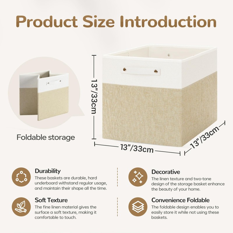 - 【High-Quality Material and Construction】These cube storage baskets are made of high-quality linen fabric, which is durable and long-lasting. The interior is lined with white non-woven fabric, and the interlayer is thickened cardboard for added strength. Thick cardboard separated at the bottom, the bins can be folded while maintaining its shape and integrity. The handle is made of thickened linen fabric, and are securely stitched for easy carrying.