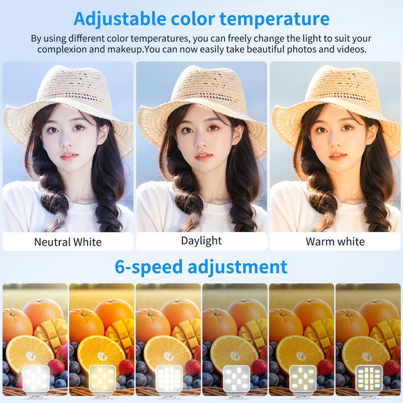 - Three Adjustable Color Temperatures: This mini LED video light includes 16 energy-efficient LED beads (8 warm + 8 cool), offering three fixed modes at 3000K, 4000K, and 6000K. With a brightness of up to 150Lx, it’s perfect for recording VLOGs with your action camera.