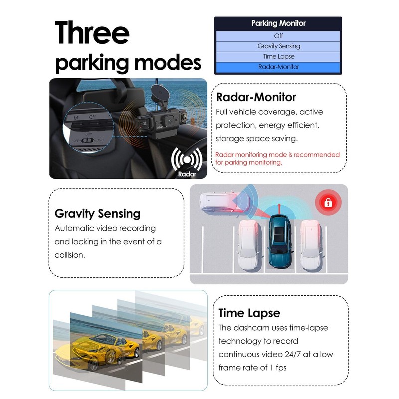 - Sharper Than a Hawk's Eye - Smart Parking Monitoring: Upgrade your parking safety with the dash camera that uses dynamic radar detection (patented technology). Say goodbye to the anxiety of missing critical moments! When a moving object approaches your car, the radar activates within 0.01 seconds (10x faster than a blink) to record critical information. High and low settings provide 360-degree coverage of the 10-16.4 ft area around your car, depending on the parking environment