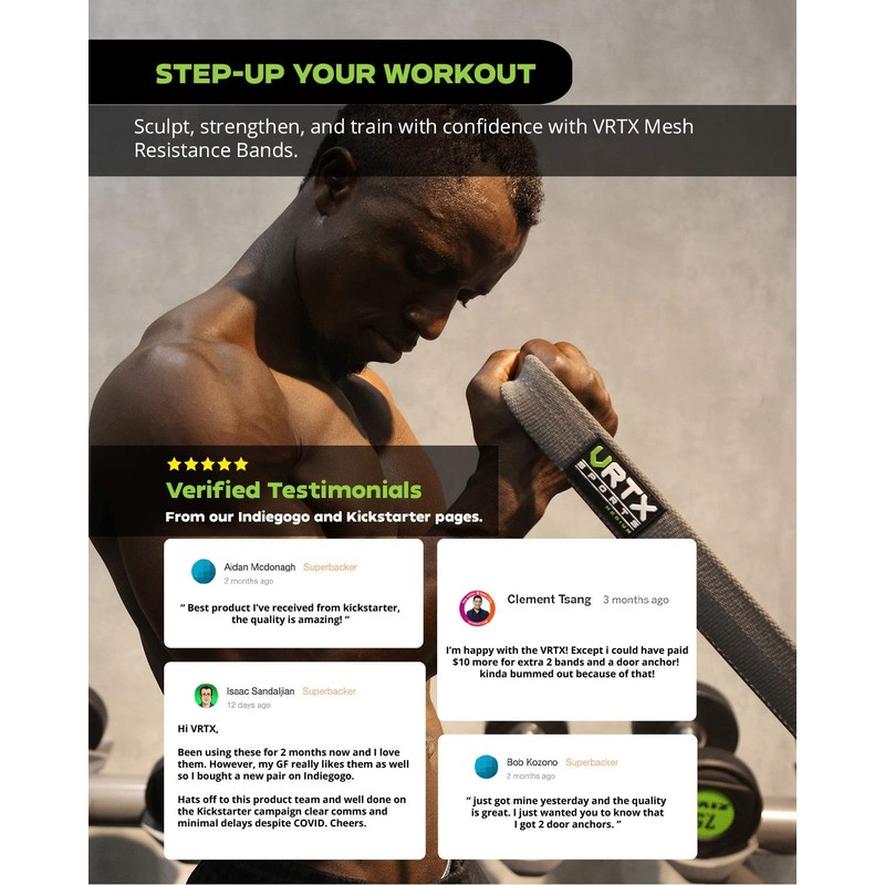 Step up your training techniques with compact, high quality, and snap- resistant exercise bands. Unlike traditional rubber workout bands, our team developed VRTX Mesh with our proprietary Intelli-Weave Technology that allows you to train without the fear of bands tearing or breaking. This unique interwoven structure combines polyester fabric fiber with latex rubber fiber that ensures extreme durability and resistance to physical damages. Stretch and pull up to 200 lbs with ease and confidence.