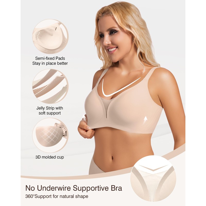 - Seamless bras with Jelly Strip - The bras for women no underwire provide full coverage, support and lift. The V-neck delicate criss-cross mesh design enhances your bust line. This everyday T-shirt bra is invisible, and non-see-through, hugging your chest perfectly.The wireless bra offer support and a perfect fit for most body shapes, from small to plus size, and cup sizes A to DD. The push-up pad creates a naturally round and full shape for younger women and provides comfort and support
