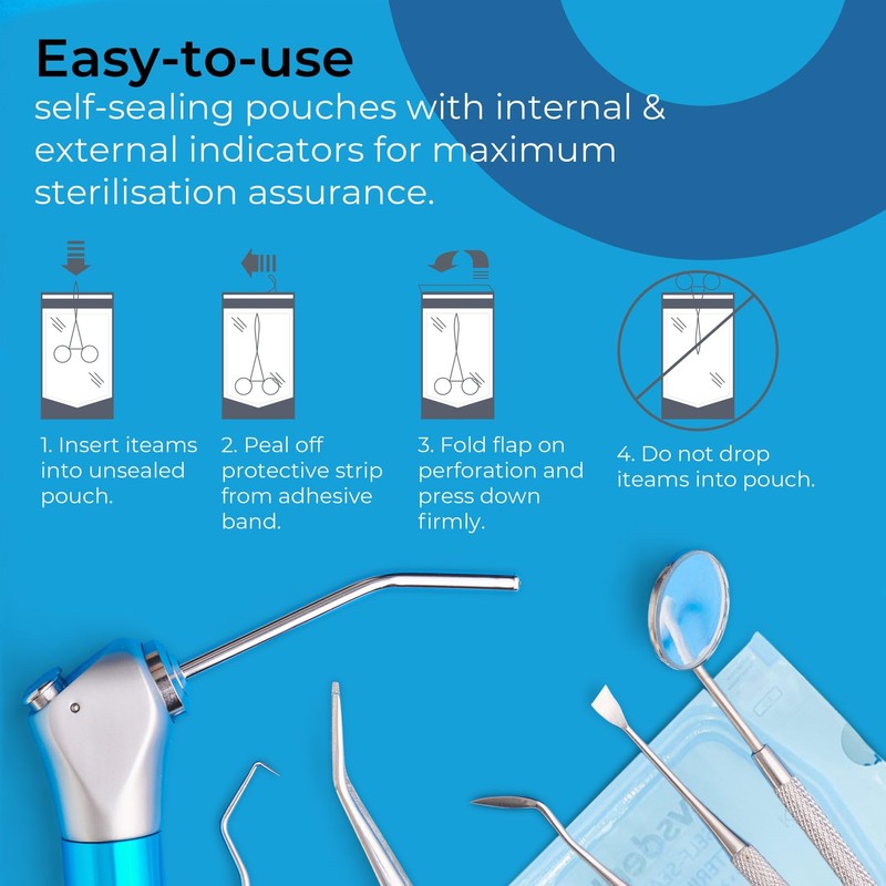 - SELF-STERILISATION ASSURANCE: VSDent Sterilisation Pouches, 70x260mm, Pack of 200, offer easy-to-use, self-sealing pouches with internal and external indicators for maximum sterilisation assurance.