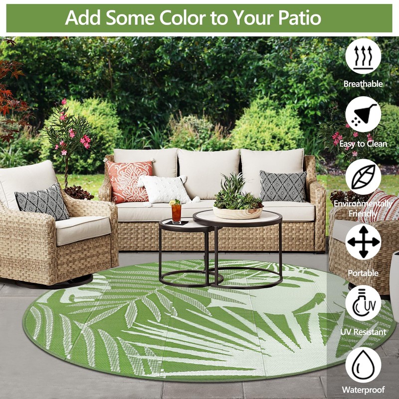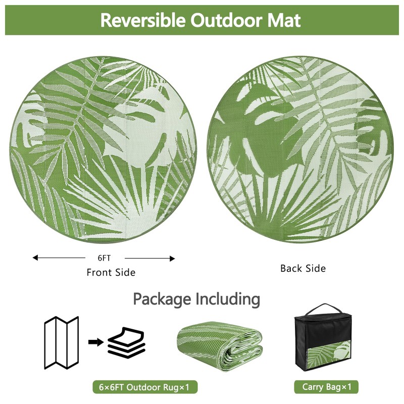 VSIWB Waterproof Outdoor Rug 6x6 ft, Reversible Plastic Straw Mat with Leaf Pattern, Round Floor Mat for Patio, Camping, Picnic, Backyard RV, Deck, Grass Green