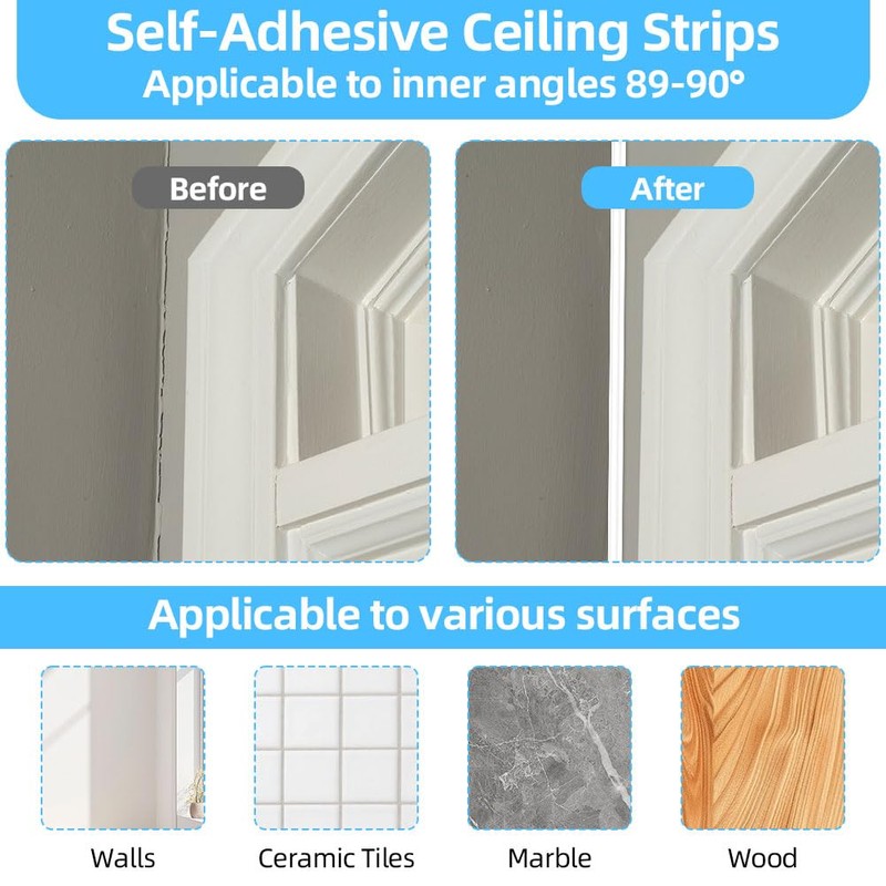 - 【HOCHWERTIGES PVC & UMWELTFREUNDLICH】Dieser flexible selbstklebende Deckenstreifen besteht aus hochwertigem PVC-Material, ist sicher, umweltfreundlich, ungiftig und geruchlos, wasserdicht und feuchtigkeitsbeständig – perfekt für Küchen und Badezimmer! Die sicher glatte Oberfläche kann mit einem Tuch gereinigt werden, während die Biegbarkeit des Materials (bis zu 90°) auch unebene Oberflächen abdeckt, ideal zum Verdecken von Rissen, abblätternder Farbe oder unschönen Nähten.