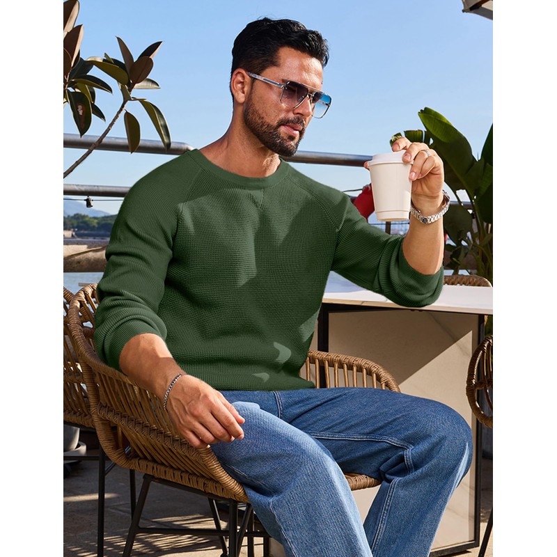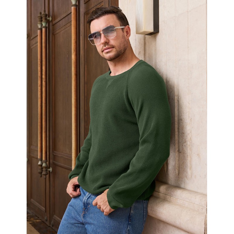 • Classic Design: This men's pullover sweater features raglan sleeve, crew neckline, waffle-textured pattern and ribbed neckline, sleeve cuffs, and hem,the delicate triangular design below the collar adds a fasion charm to its classic style.