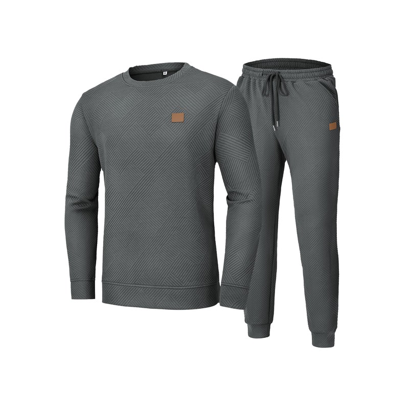 - Unique Design: A classic crew neck with a distinct geometric texture adds a modern touch. The pants feature an elastic waistband with an adjustable drawstring, 2 deep side pockets, and 1 back pocket for practical storage. The tapered legs create a streamlined silhouette—perfect for jogging, workouts, or laid-back streetwear.