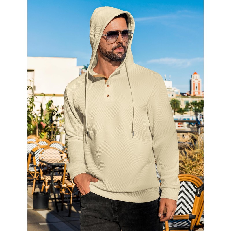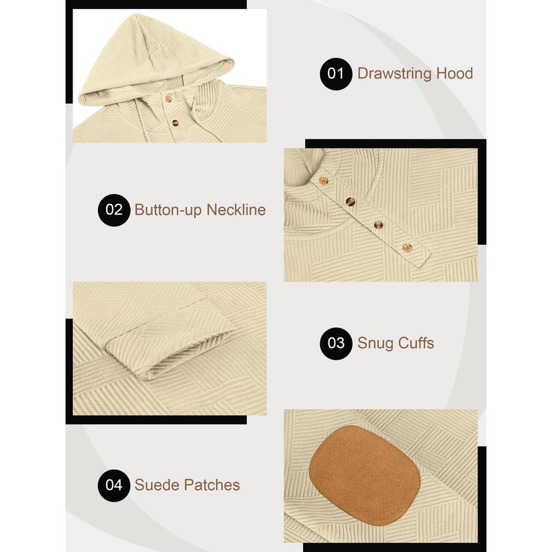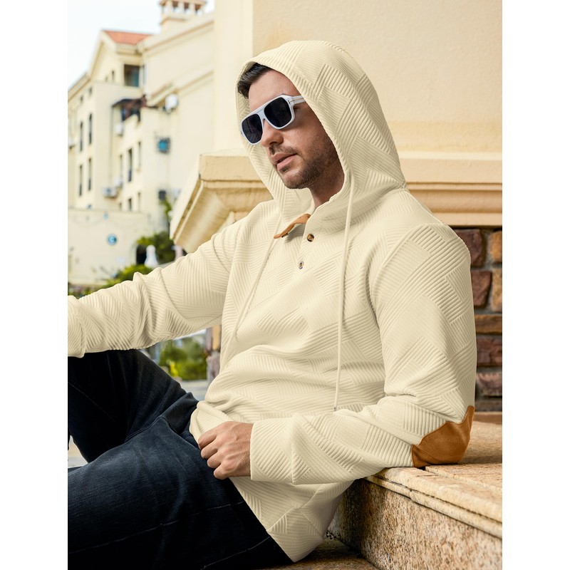 - Stylish Design: Men's hoodie sweatshirts feature a subtle jacquard pattern, long sleeves, a button-up neckline, and an adjustable drawstring hood. Suede accents at the collar and elbows add a modern, fashionable touch that sets you apart.